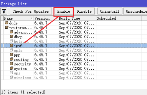 首先需要确认你的 RouterOS 已经安装并启用了 IPv6 功能包,MikroTik 硬件的 RouterOS 都带有 IPv6 功能
